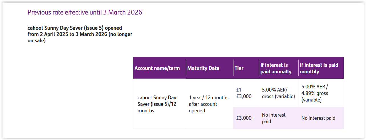 The original post of this string was about the Santander Regular Saver which does still have a fixed interest rate at 5% AER. Not the Cahoot Sunny Day Saver