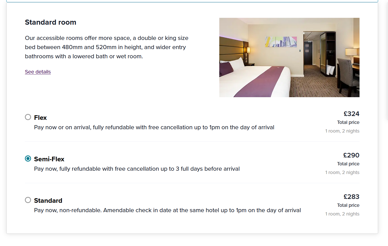 "We understand the importance of having a fully accessible room, and currently, trivago does not offer a specific search filter for accessible rooms. However, many accommodations do provide information about their accessibility features in their property descriptions, which you can review when you’re looking through options on trivago.If you're looking to book directly with an accommodation such as Premier Inn, we encourage you to continue using their site for booking, as they allow you to choose accessible room options. When you find a property you like on trivago, you can click on the 'View Deal' button to navigate to the booking site where you can complete the reservation."