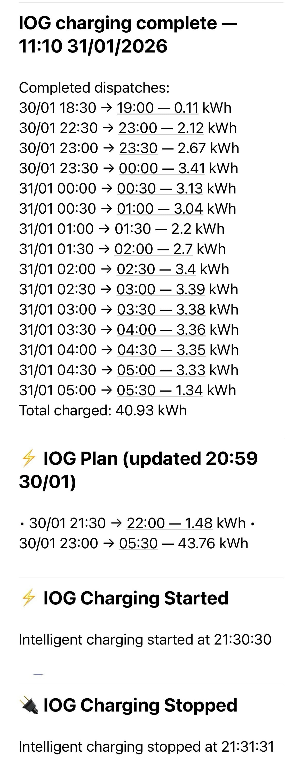 I have the Intelligent Octopus integration in Home Assistant, and these are the extracts of emails I sent myself to do with charging: