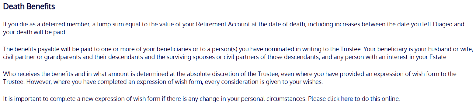 Death benefits - absolutely standard stuff. Just be aware that you need to keep your Expression of Wish form up to date while you still have benefits in the scheme, to guide the trustees on what you'd like to happen to your cash if you die before taking your cash out.