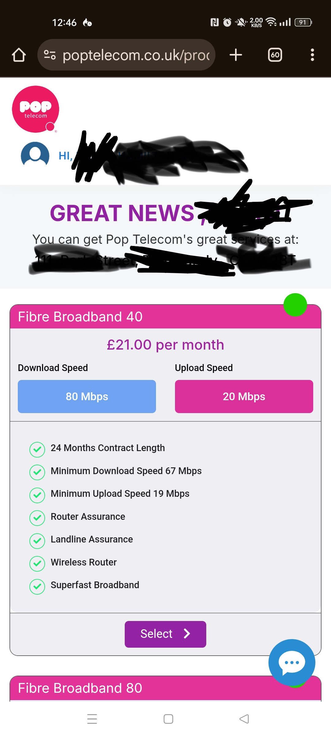 I ordered pop 40 which stated for me that there would be speeds of 80mb with minimum speeds of 67mb, I have screenshot evidence of this attached, I have since found out that now on the website, as they have ammended it and confirmed via telephone that it says they intend only 40mb.