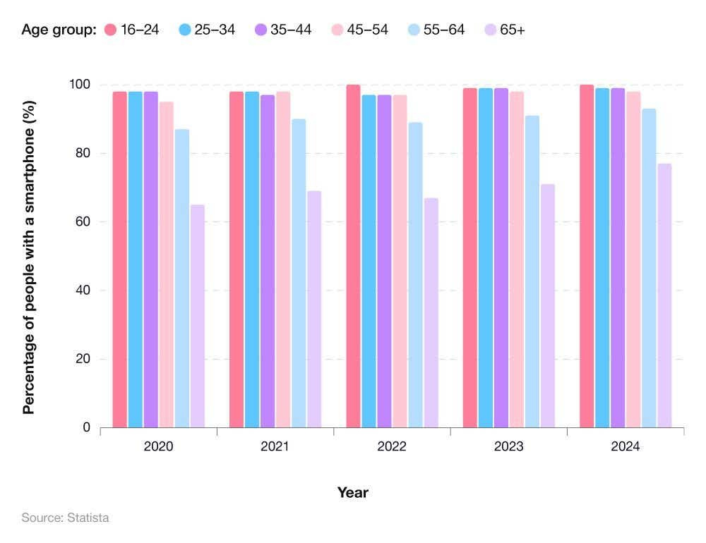 "AI Overview - Approximately 59% to 76% of adults aged 65-70+ now own a smartphone".