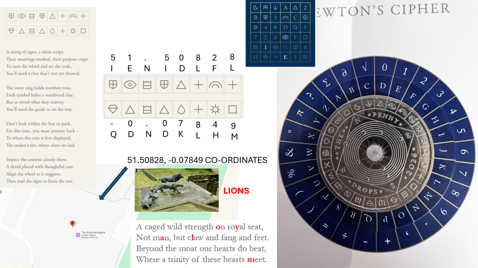 Usa the above image to set Newton's Cipher with the coin inside. Then the answer is in the number wheel