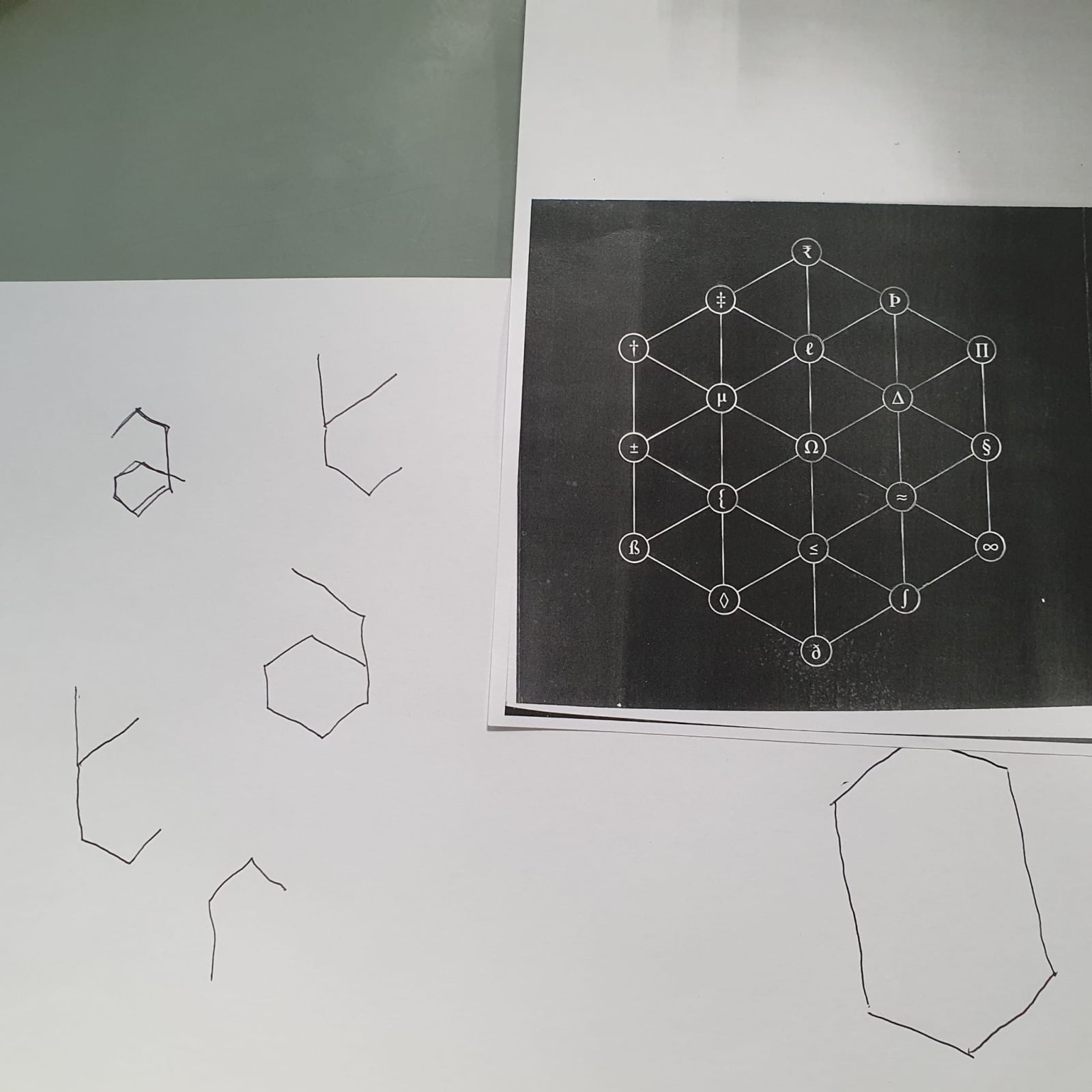 Put a piece of paper over the hexagonal grid in the pack and trace between the symbols using a pencil, the lines will look like letters