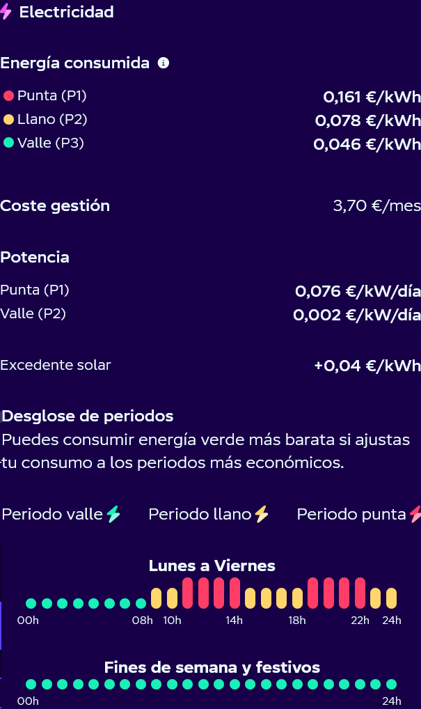The prices per kWh are quite low but there's a monthly management charge of 3.70 and the "potencia" standing charge depends on how much power you're allowed to draw from your supply. In the OP's case they have a 6.5kW supply, ~28 amps at 230V, so 7.8 cents per day per kW would be 50.7 cents per day. A little less than the UK standing charge, but most UK homes have a supply capable of 60, 80 or 100A. 6.5kW wouldn't support most electric showers, for example, but would suffice for an immersion tank with stored HW.