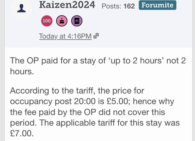 If the OP had arrived after 20:00 then I would agree the overnight charge applies, but they did not. They arrived when the tariff was £2.00 for 2 hours. They stayed 2 hours, the time paid for.