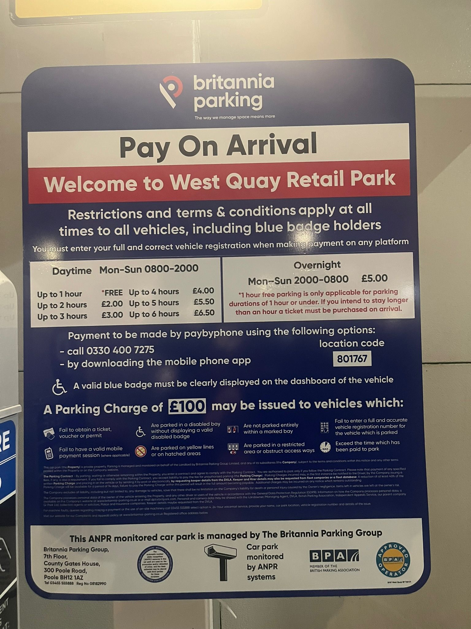 Got a letter in the post with a charge of £100 claiming that I had "failed to make a valid payment". Appealed to the company, but failed. They also said we could have paid the overnight charge after our stay which is not at all clear from the sign.