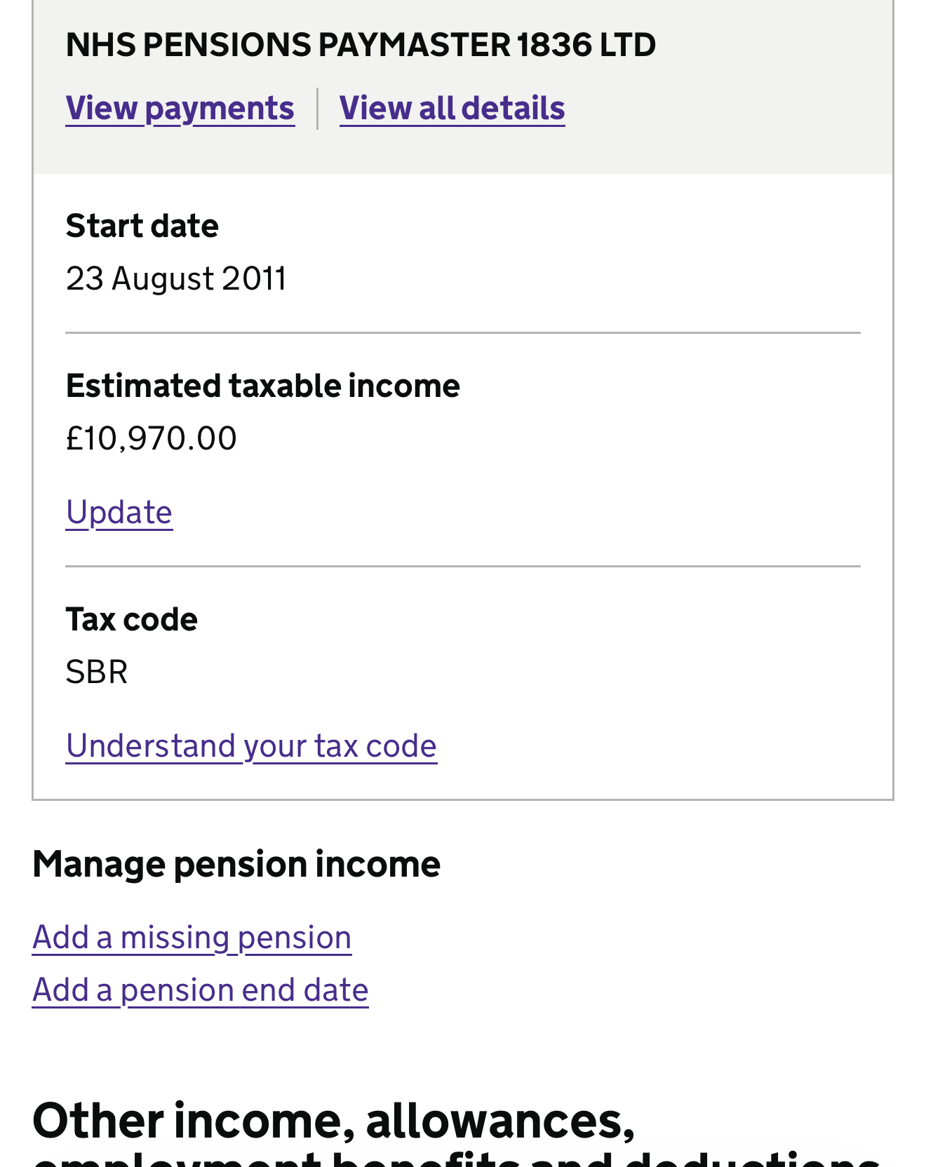 If you click on the payments what does it show each month for the gross pension amount and the tax deducted, you can't assume HMRC and Paymaster are singing from the same hymn sheet. You should have received another payslip on a change of tax code from SD0 to SBR. Depending on which particular layout your HMRC account is using, yes there are more than one !, you may be able to see a blow by blow account of each tax code change for a particular income source over the whole year, other layouts will only show the last change.