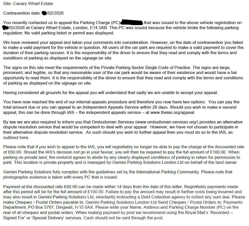 I am writing to raise a formal complaint regarding Parking Charge Notice reference XXXXXXXX issued by Gemini Parking Solutions on XX/02/2026. The PCN states the location as Canary Wharf Estate, South Colonnade.