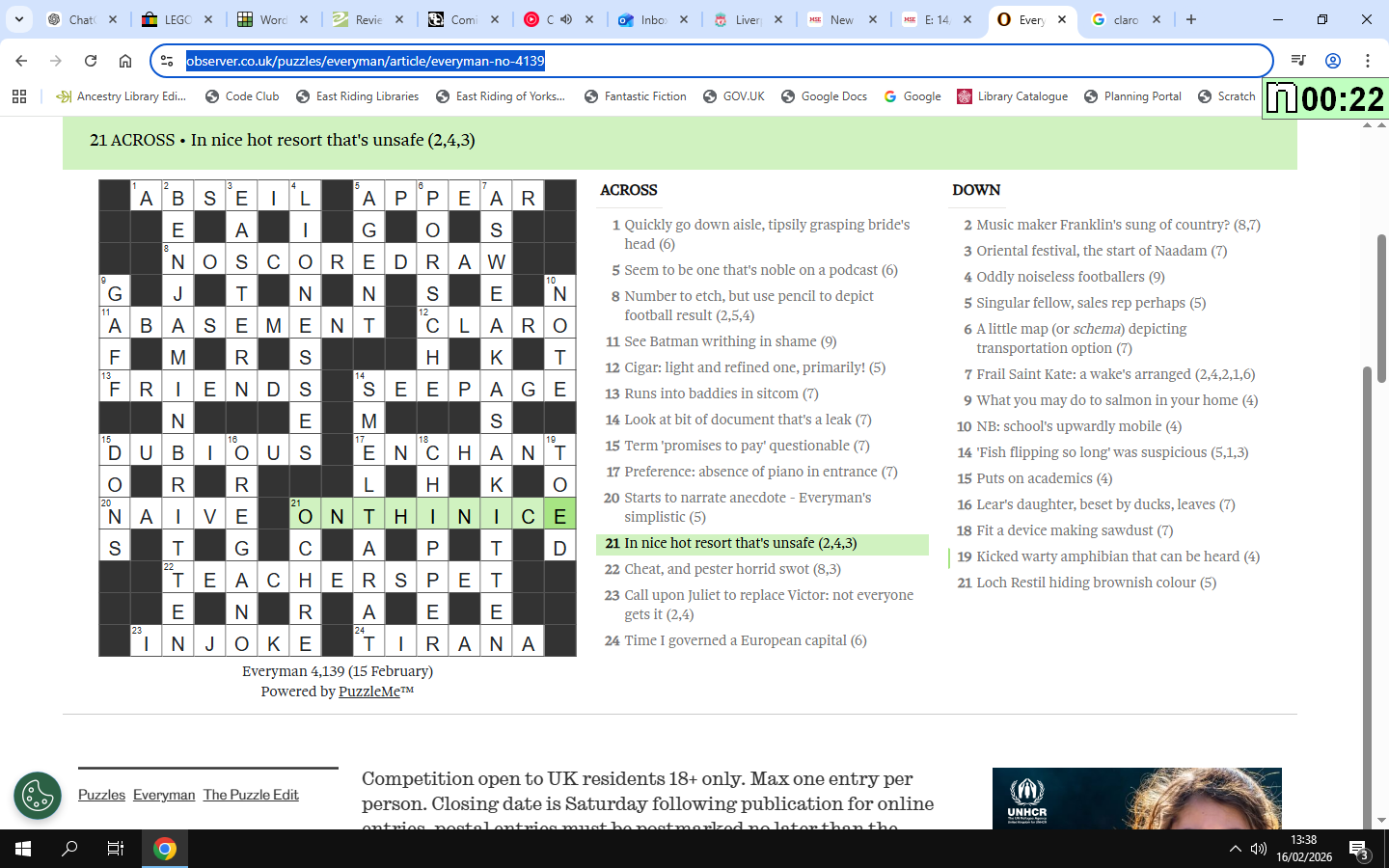 E: 21/02 Win £15 Book Token (The Observer Everyman Crossword No 4139)