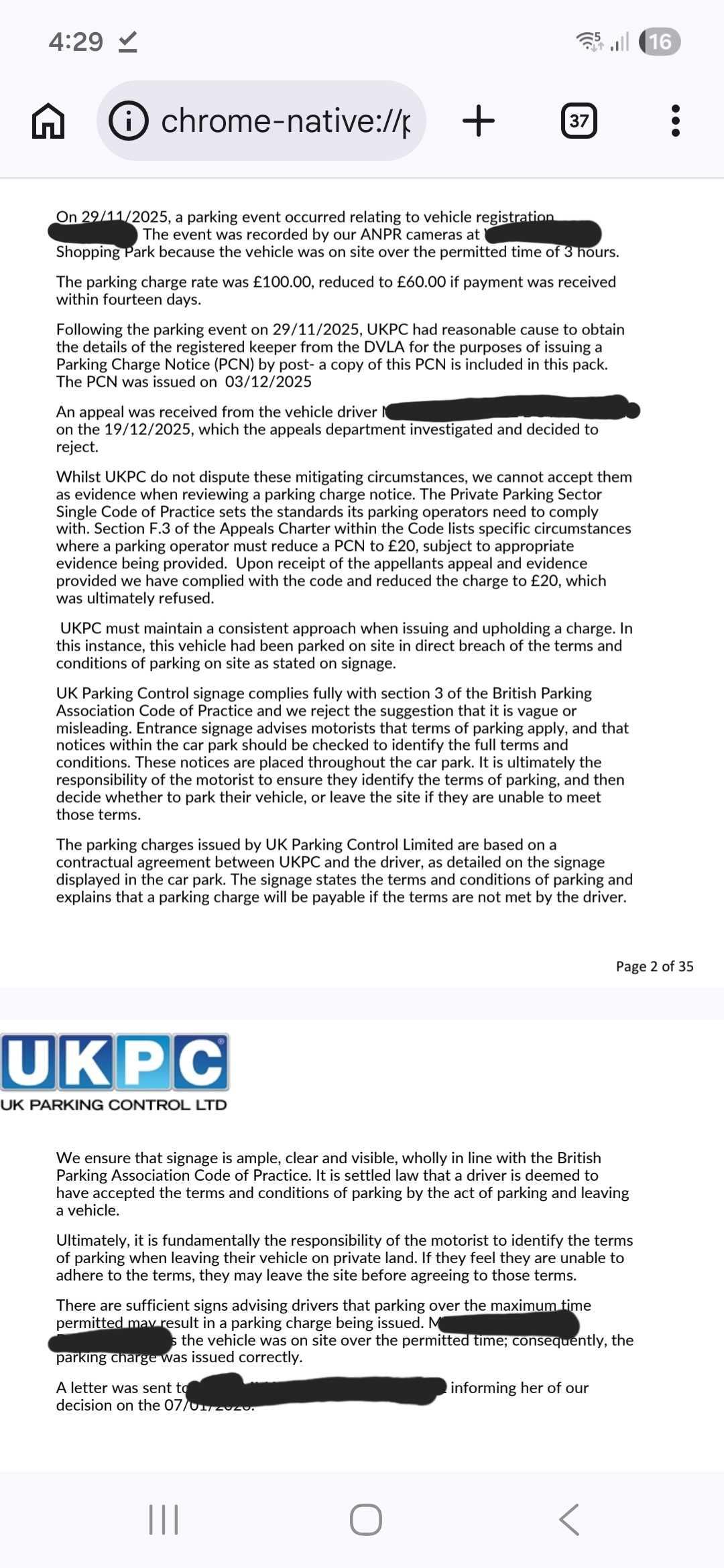 Long story short, UKPC issued fine for overstaying their 3 hour limit for the shopping park.