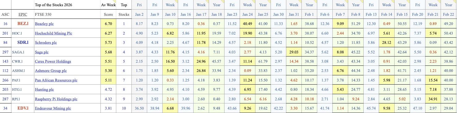 I own shares in the two companies highlighted in red. Almost 75% profit from January. On a £1k stake in each, forgetting charges, I'm up £1,500. Not bad in 7 weeks.