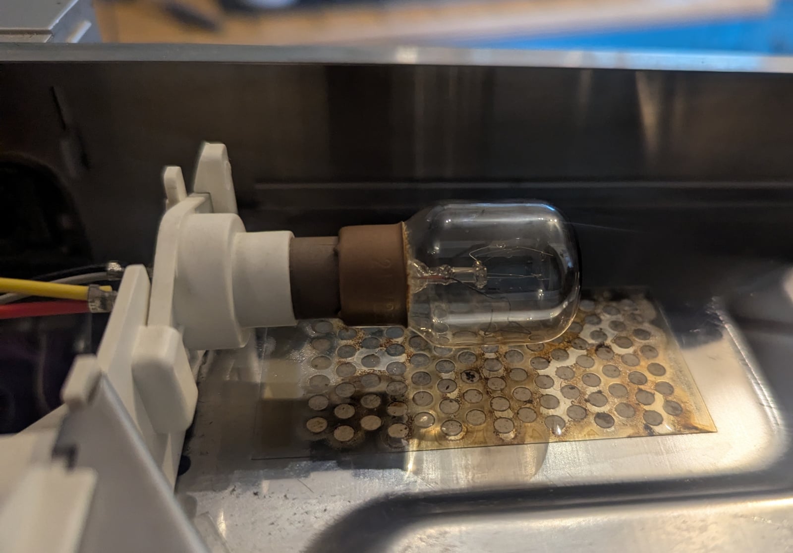 So, I think I can safely say that the lamp does not get hot from the oven, and will be comfortably at below 100oC, so I'm going to chance an LED if I can get one bright enough. It should provide a better light than the pale orange glimmer of the filament…