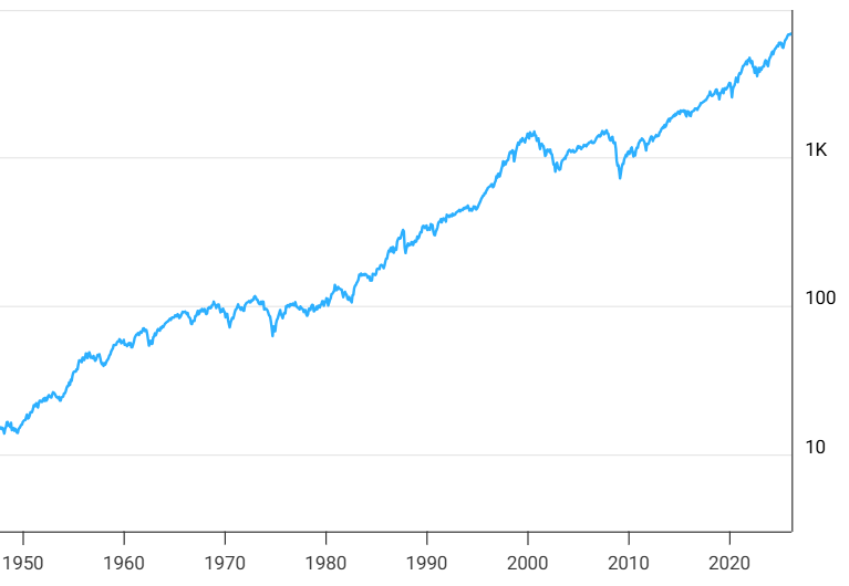 The chart below shows the S&P 500 from 1950 to 2026, but in a logarithmic format which emphasises the annual percentage increase, not the absolute value, and as a result appears far less "peaky" than the usual charts you see most days.