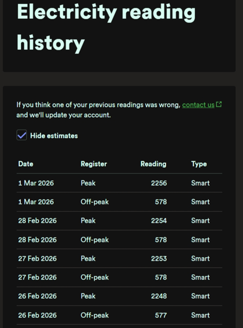 I wasn't asking about the usage data (the graphs etc.), but the actual readings. My supplier provides a list of every daily reading since I first got a smart meter 10 years ago, and all the manual ones before that. I don't know whether Octopus do the same, but since you see half-hourly usage data, I'd expect you should also be able to see the daily readings. It's the only way to see whether the meter's communicating properly between bills. These are mine today: