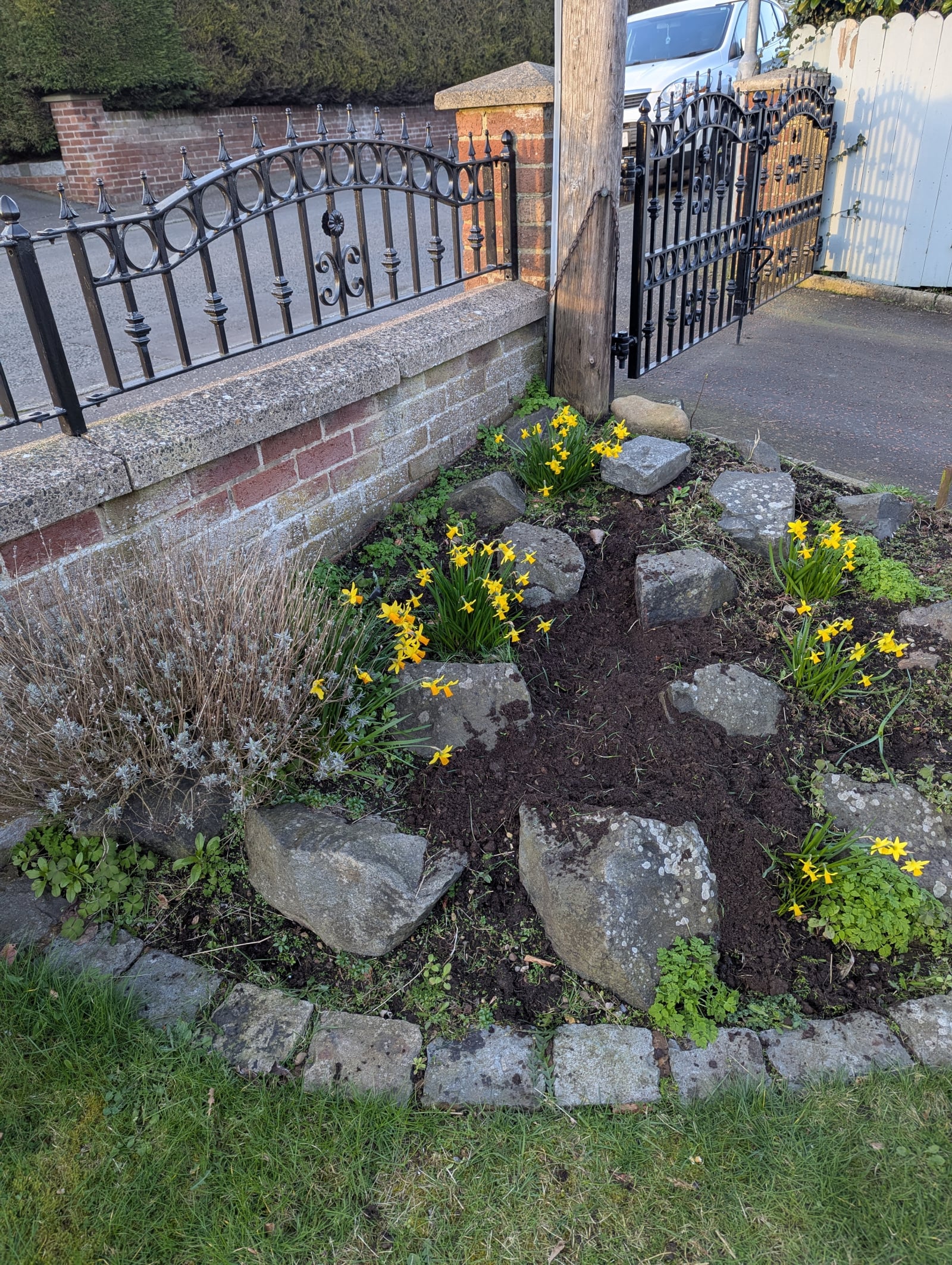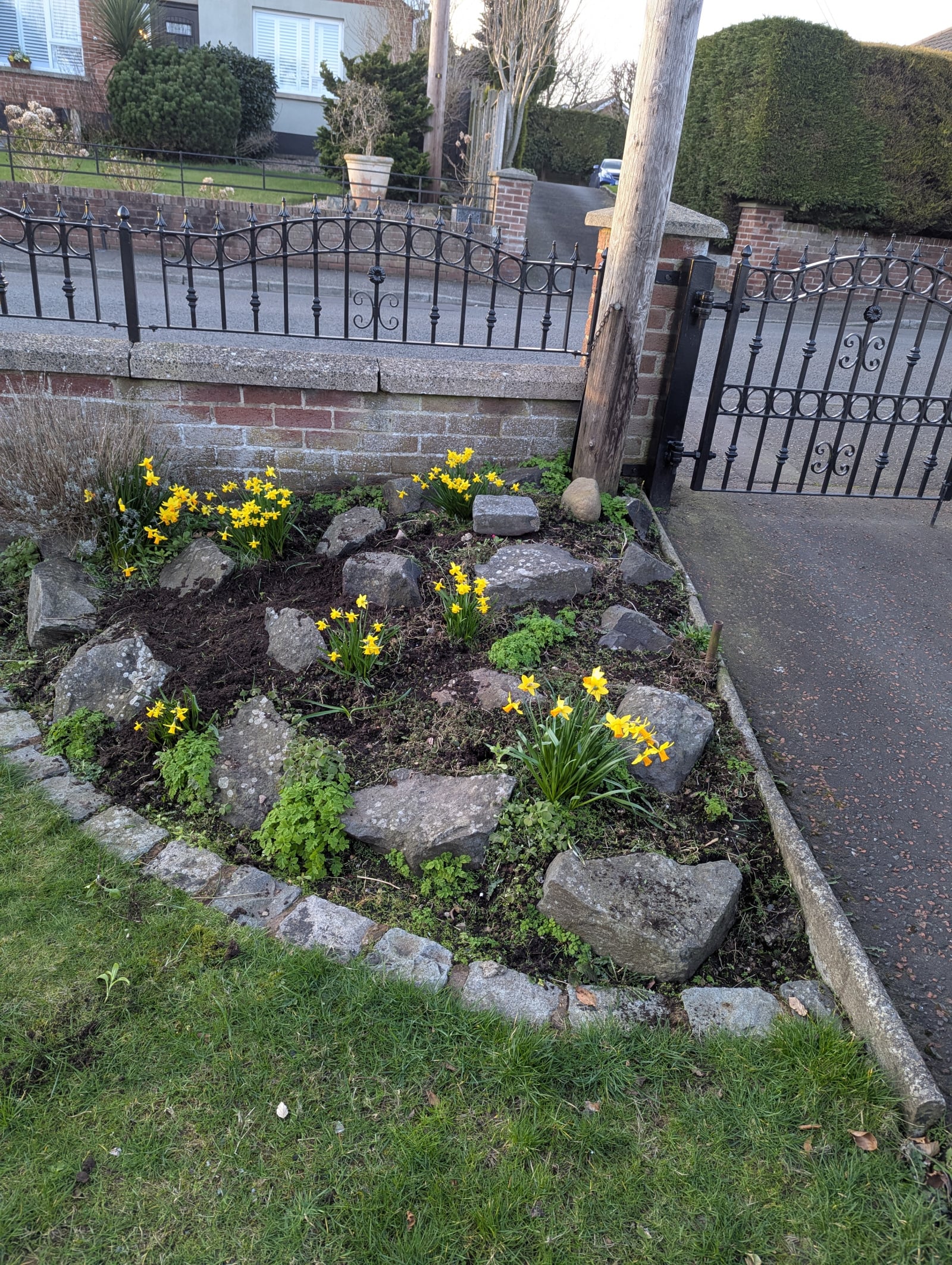 If you have any, or buy some, Fish Blood & bone fertiliser, or any long term feed you fancy, a good sprinkle & gentle rake in will feed over the season & help build the daff bulbs up for next spring flowering