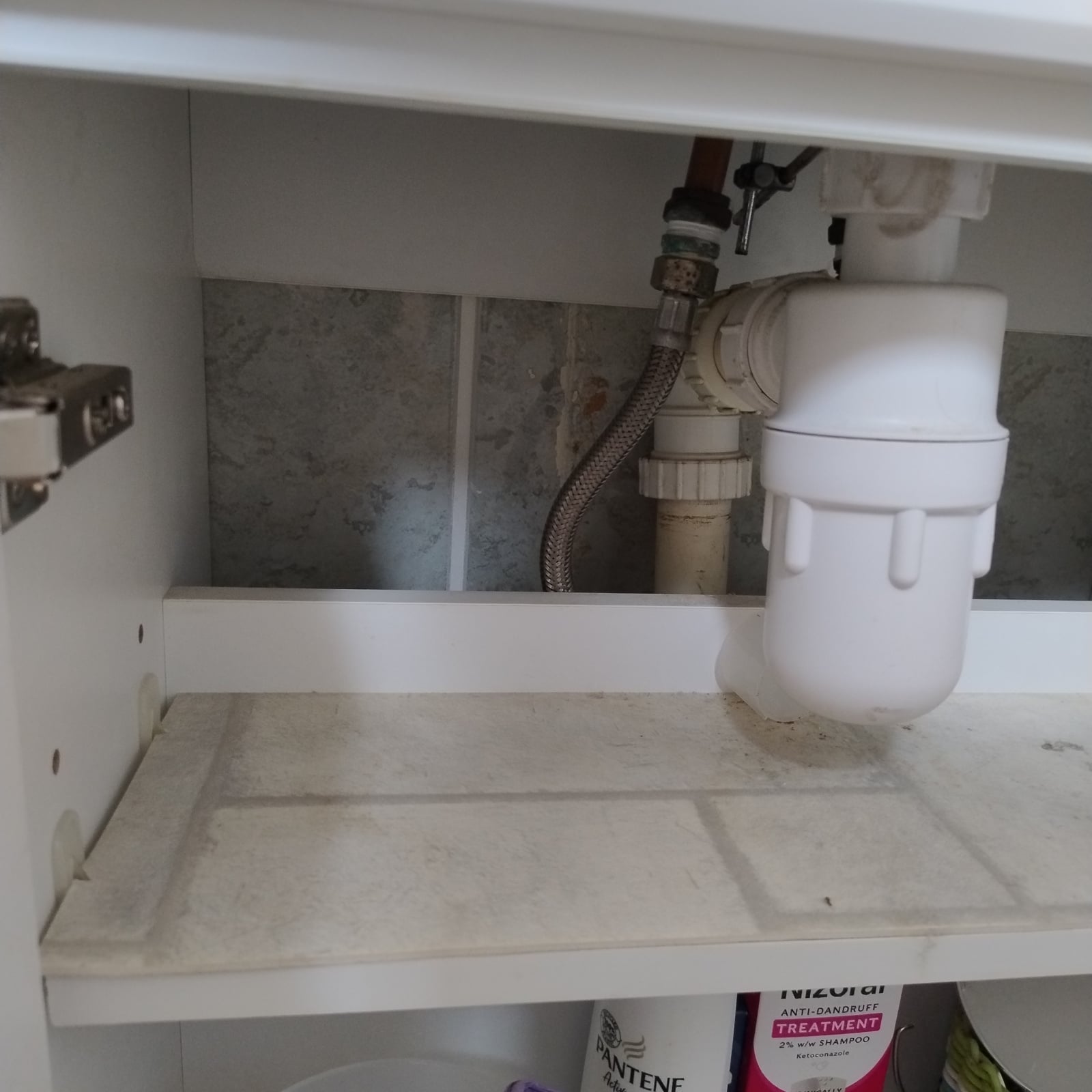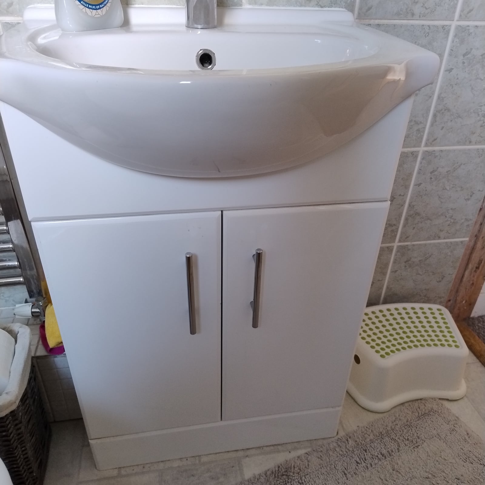 Here's a couple of pics. It's a basic vanity unit, probably from B&Q or Homebase with a back panel rising up at the back. I've had a closer look and it can't be removed as its locked in place with cams on the rear so you'd need to dismantle sides first. You can just about reach the connections at the back but blindly so god knows whoever fitted it didn't make it easy for themselves.
