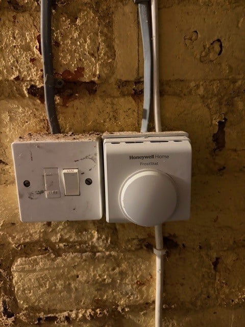I am trying to work out what has caused the power to my boiler to fail. It is oil fired. The problem appears to be from the frost thermostat but I don't know why that should be. Picture attached showing the wiring. Mains power comes into fused switch on left - there is power to the switch and the fuse works, as does the switch. There is also power (presumably flowing from) the frost thermostat through the T&E cable leading from the top of the thermostat. The white cable leading out of the top of the thermostat goes to the water pump on the heating system, and the cable leading out of the bottom goes to the boiler. There is no power to the boiler. I think the problem must be with the thermostat but I don't know why - the thermostat was replaced a couple of years ago because it had failed - but in that case the boiler was running constantly. Any pointers gratefully received.