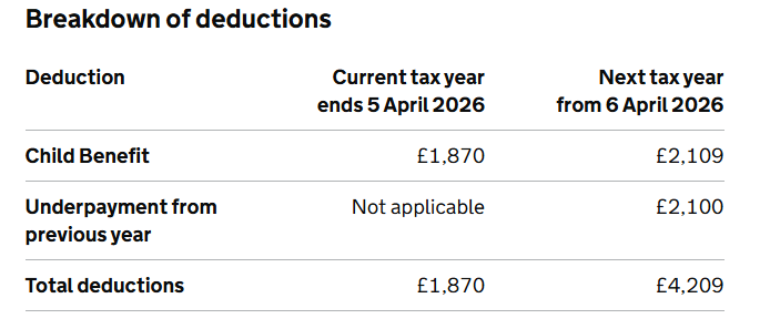 My tax code has been updated for 26-27 as shown. I assume the £1870 in the current tax year includes the deductions I am currently making via my tax code change (tax years 24-25 + 25-26). Hoping someone can help with the charges for next tax year, both the underpayment and child benefit seem far too high.