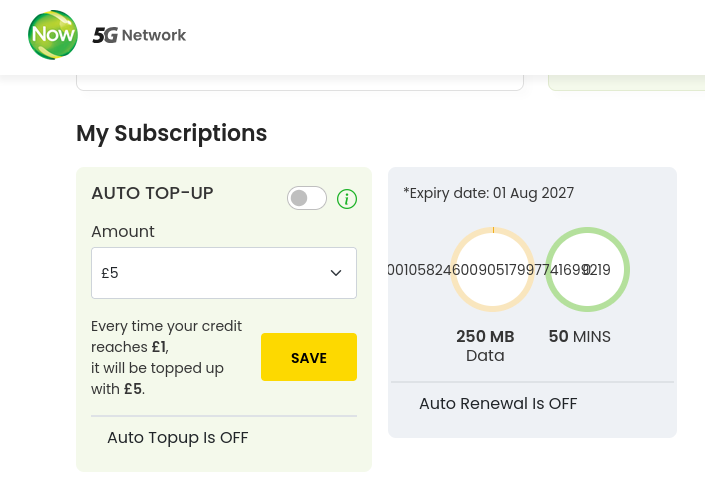 I bought my first RWG SIM with the free 50/50/250 bundle on 9th August 2022 and the expiry date on the Now website says 1st August 2027.
