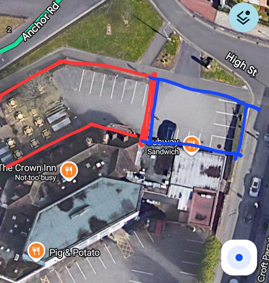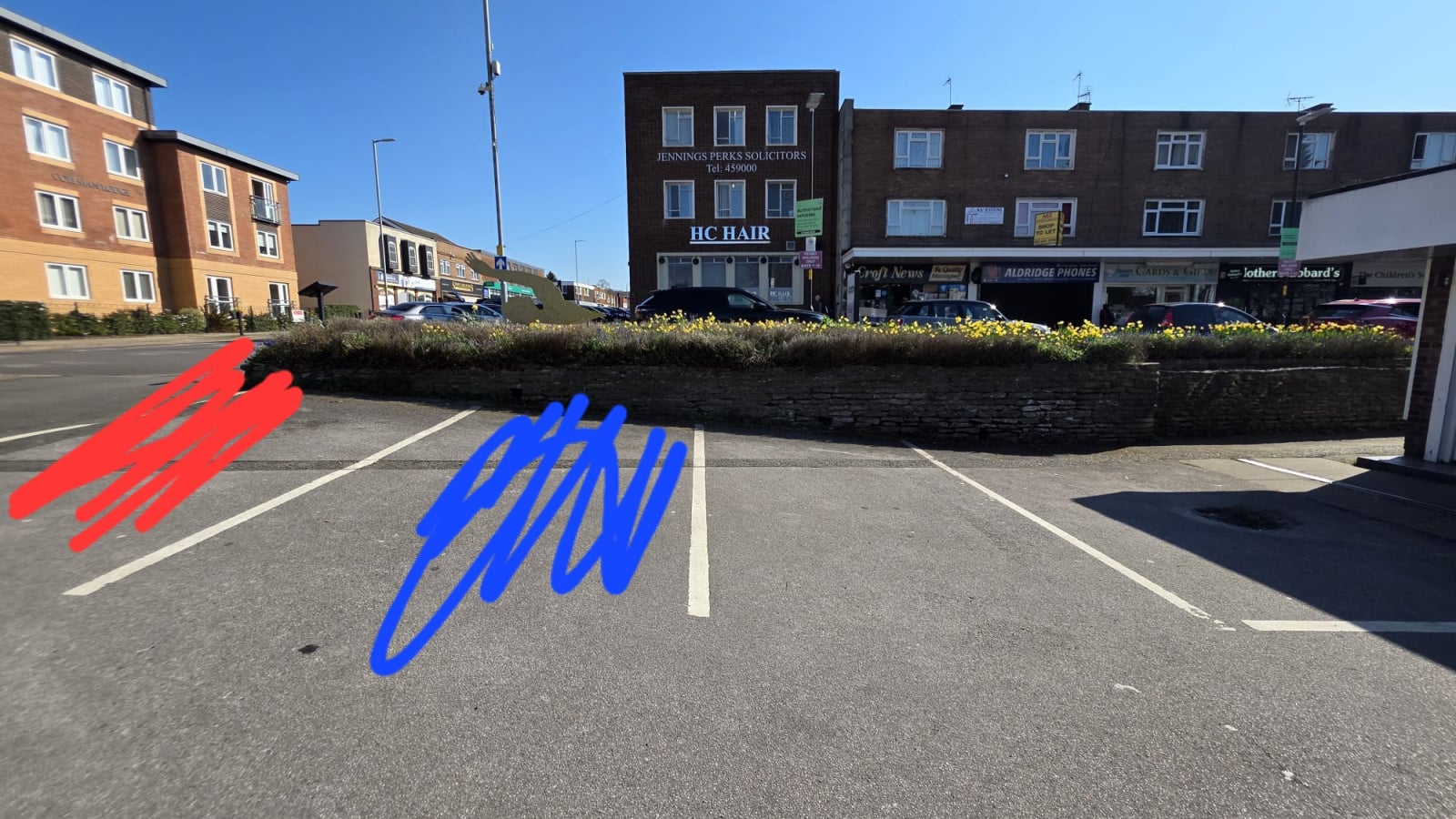 Red scribble is where I parked, blue scribble where another was
