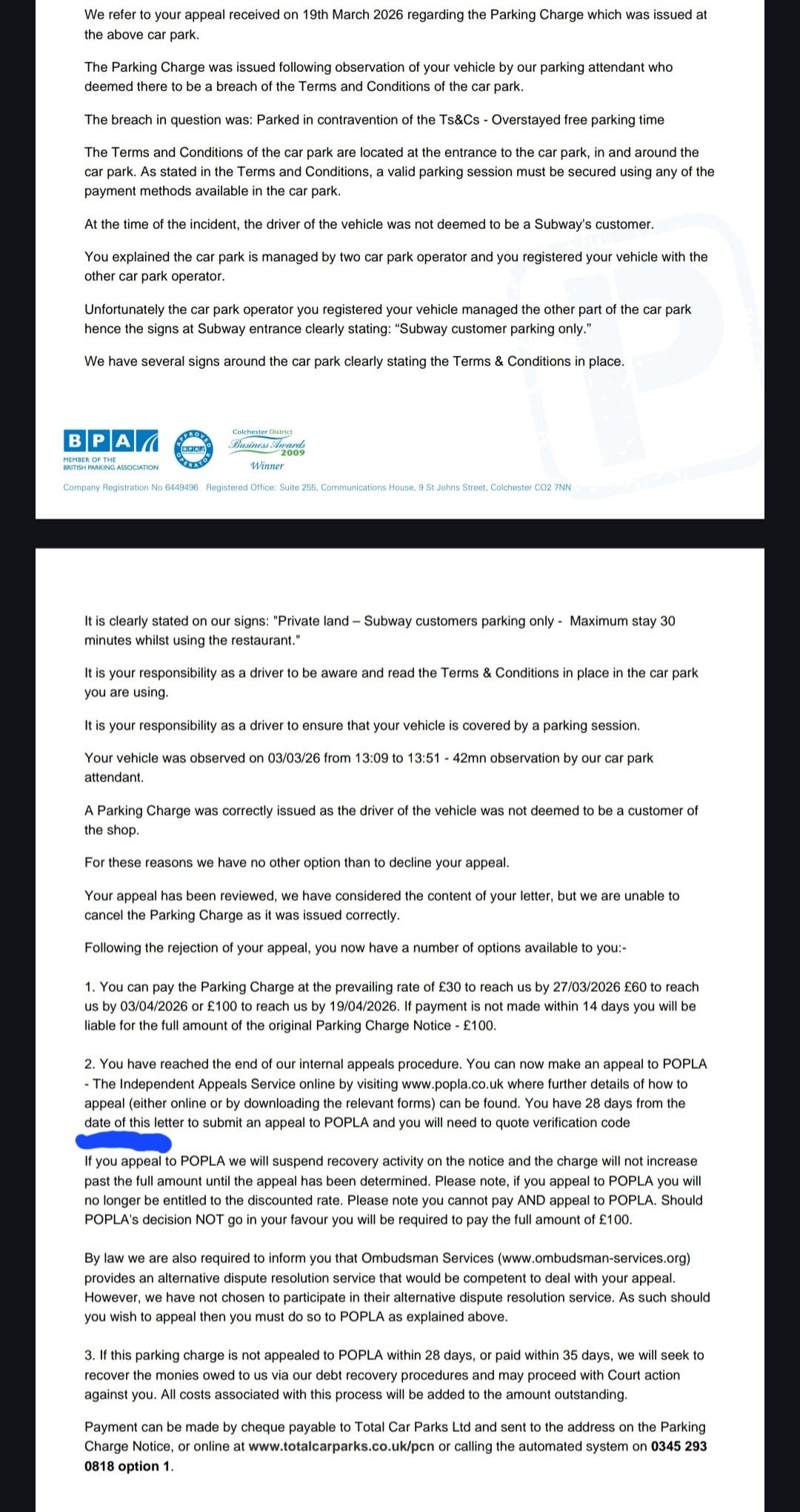 Appeal to Popla next. Make sure you state that the lack of signage means that no contract was ever formed between the driver and Total and no contract exists to be breached.