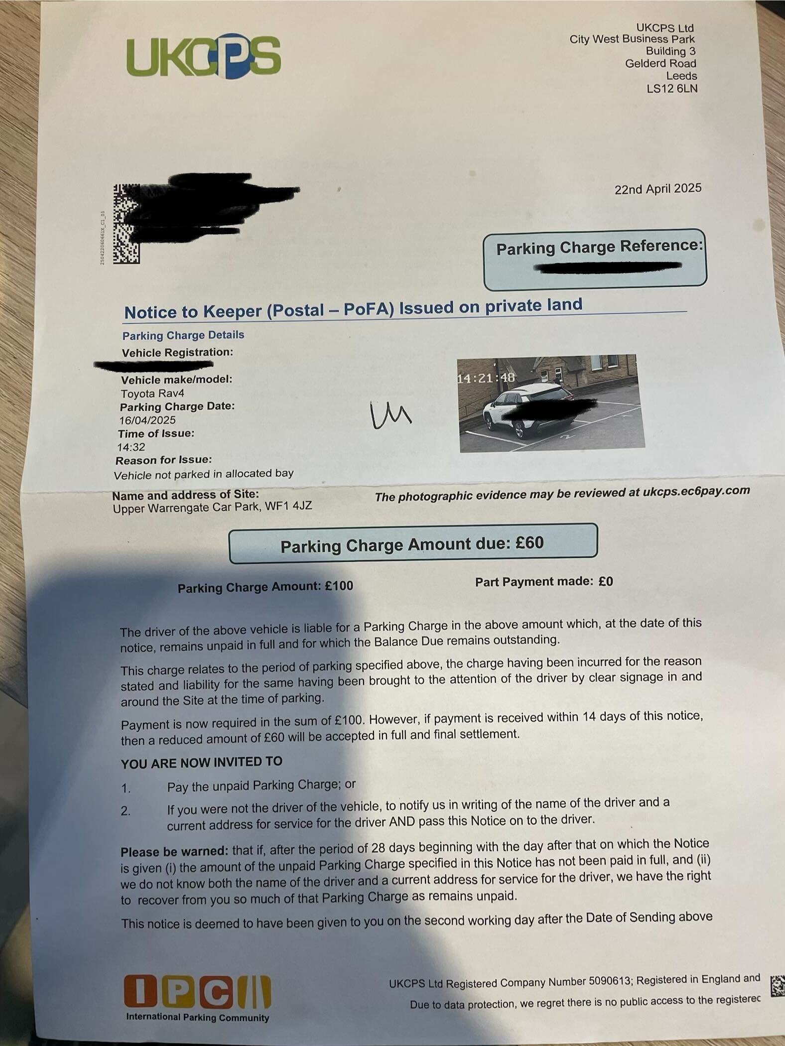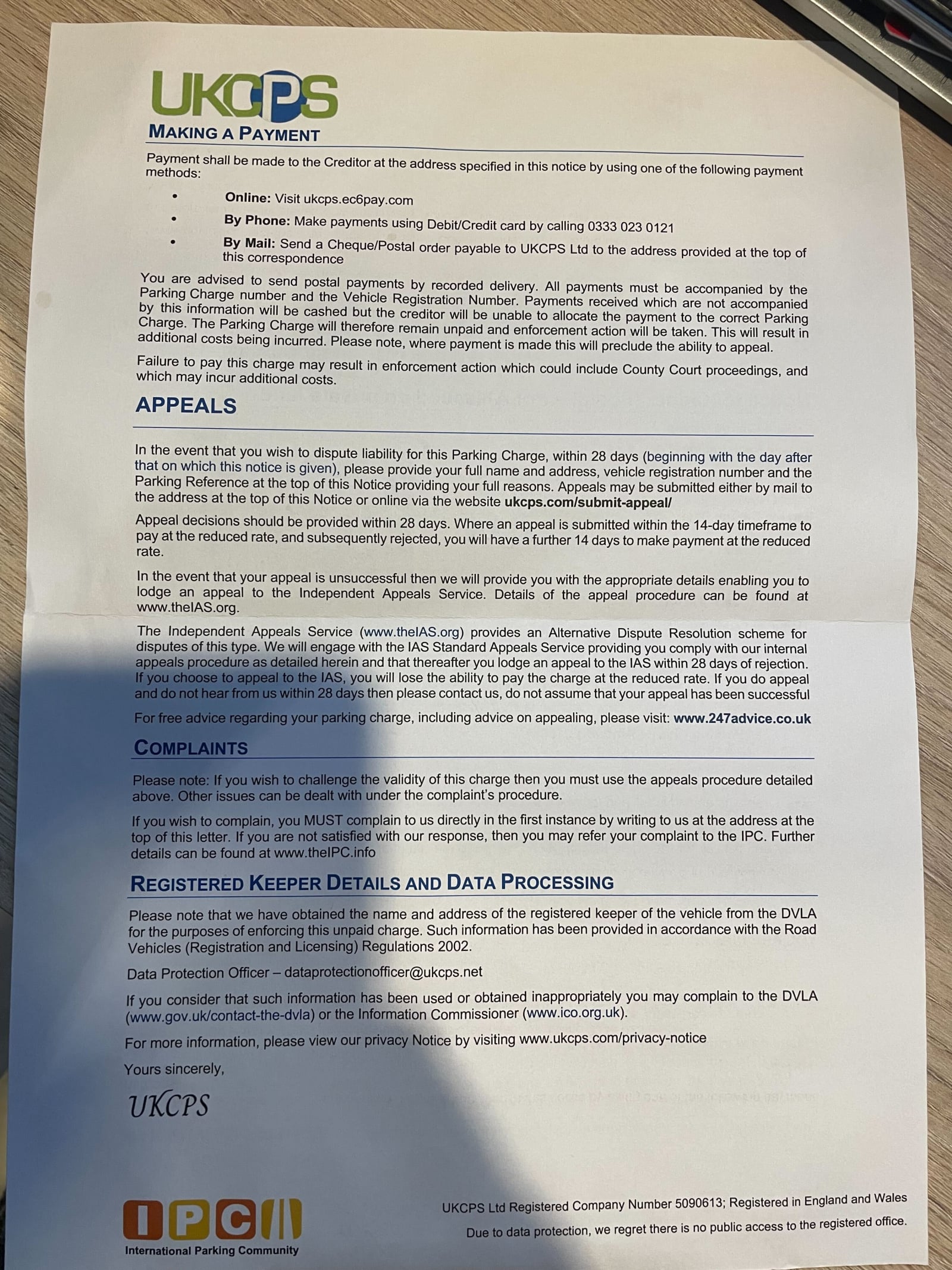 Then few days later - "invoice" from UKCPS. I responded right away disputing it on the above grounds (we did not inconvenience anyone, stopped the car park from operating efficiently nor caused loss of revenue to any businesses on the property), dispute denied (obviously). Went to IAS but obviously they said invoice is "lawful" because there is signage, and that's all they do - they do not apply "common sense".