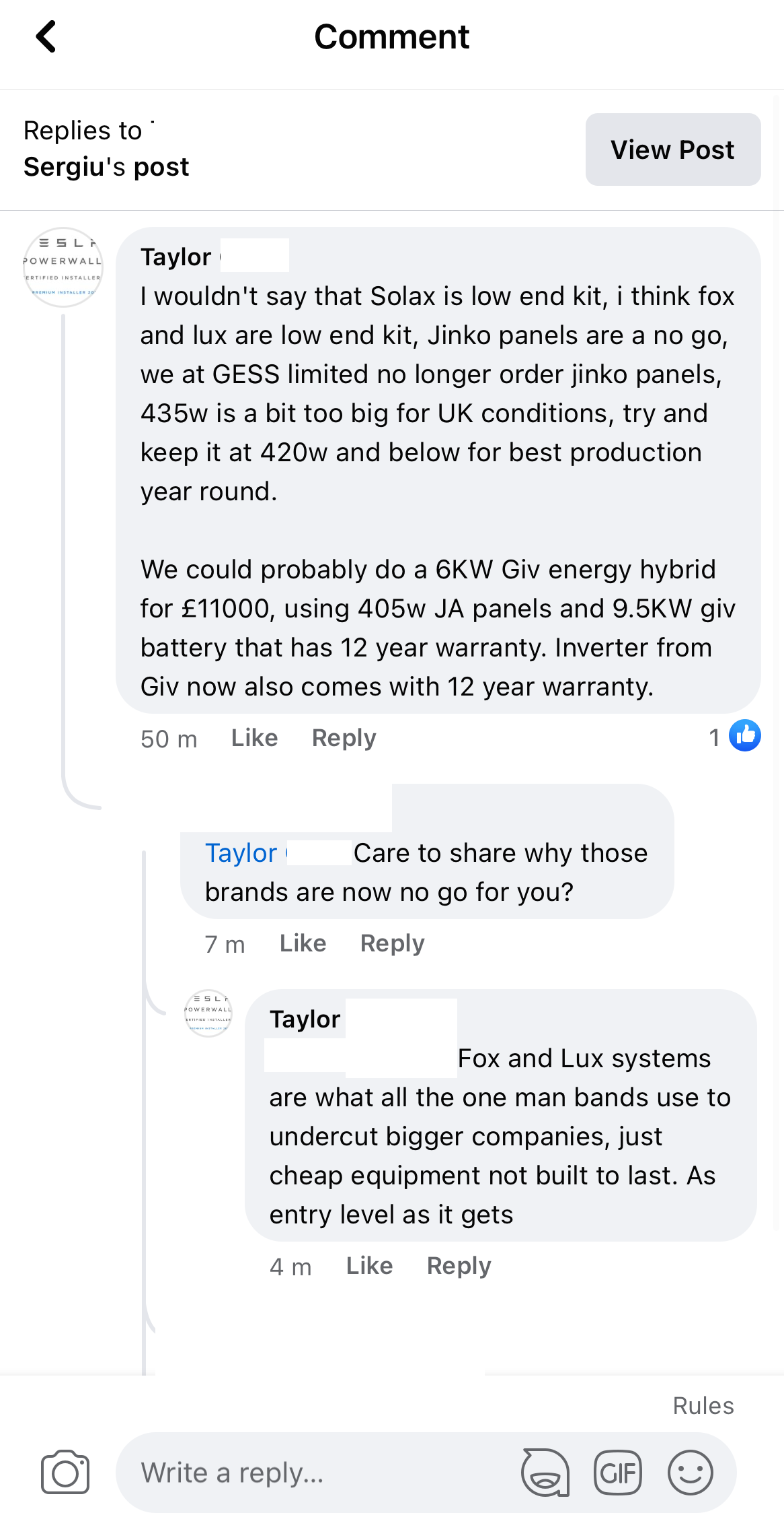 My view is it isn't worth the risk when a larger & more capable 13.5kW Tesla PW3 based system paired to 14 X 515W bifacial panels costs ~£11.5K. Fox can't hold a candle to the PW3 on performance and ownership experience