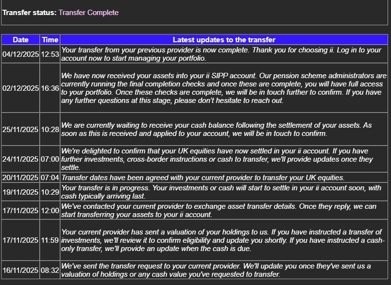I say the remnants of my HL SIPP and ISA as I transferred the bulk of my investments several years ago to ii as a cash transfer and felt I lost quite a bit of money by doing it in cash rather than in specie. At the time I could not transfer the small proportion left in my SIPP and ISA that was locked as a result of the Woodford failure. As its only small beer I don't care too much about the mode of transfer.
