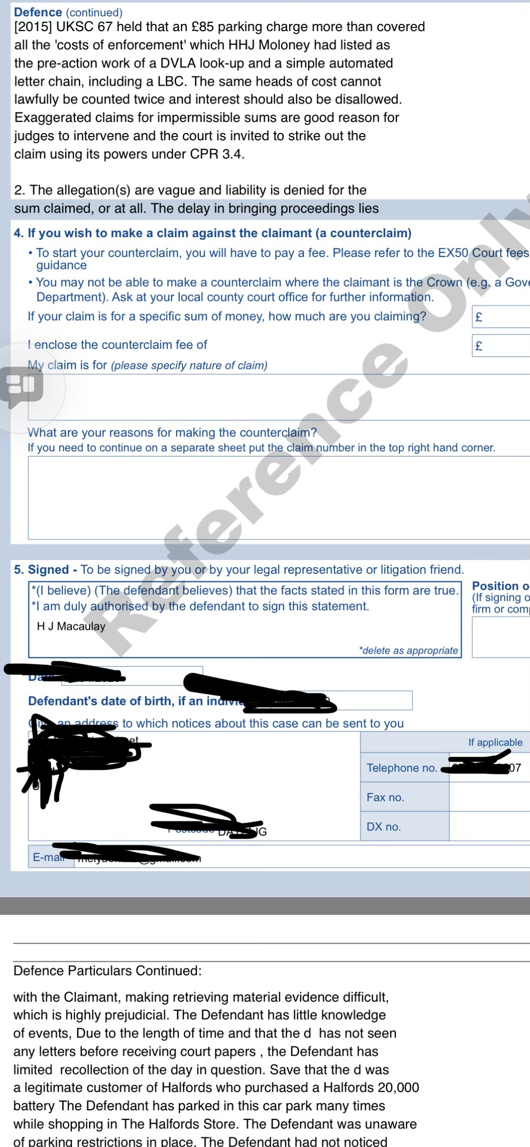 2. The allegation(s) are vague and liability is denied for the sum claimed, or at all. The delay in bringing proceedings lies with the Claimant, making retrieving material evidence difficult, which is highly prejudicial. The Defendant has little knowledge of events, Due to the length of time and that the d has not seen any letters before receiving court papers , the Defendant has limited recollection of the day in question. Save that the d was a legitimate customer of Halfords who purchased a Halfords 20,000 battery The Defendant has parked in this car park many times while shopping in The Halfords Store. The Defendant was unaware of parking restrictions in place. The Defendant had not noticed any ‘Prominent’ signage close to where the vehicle was parked