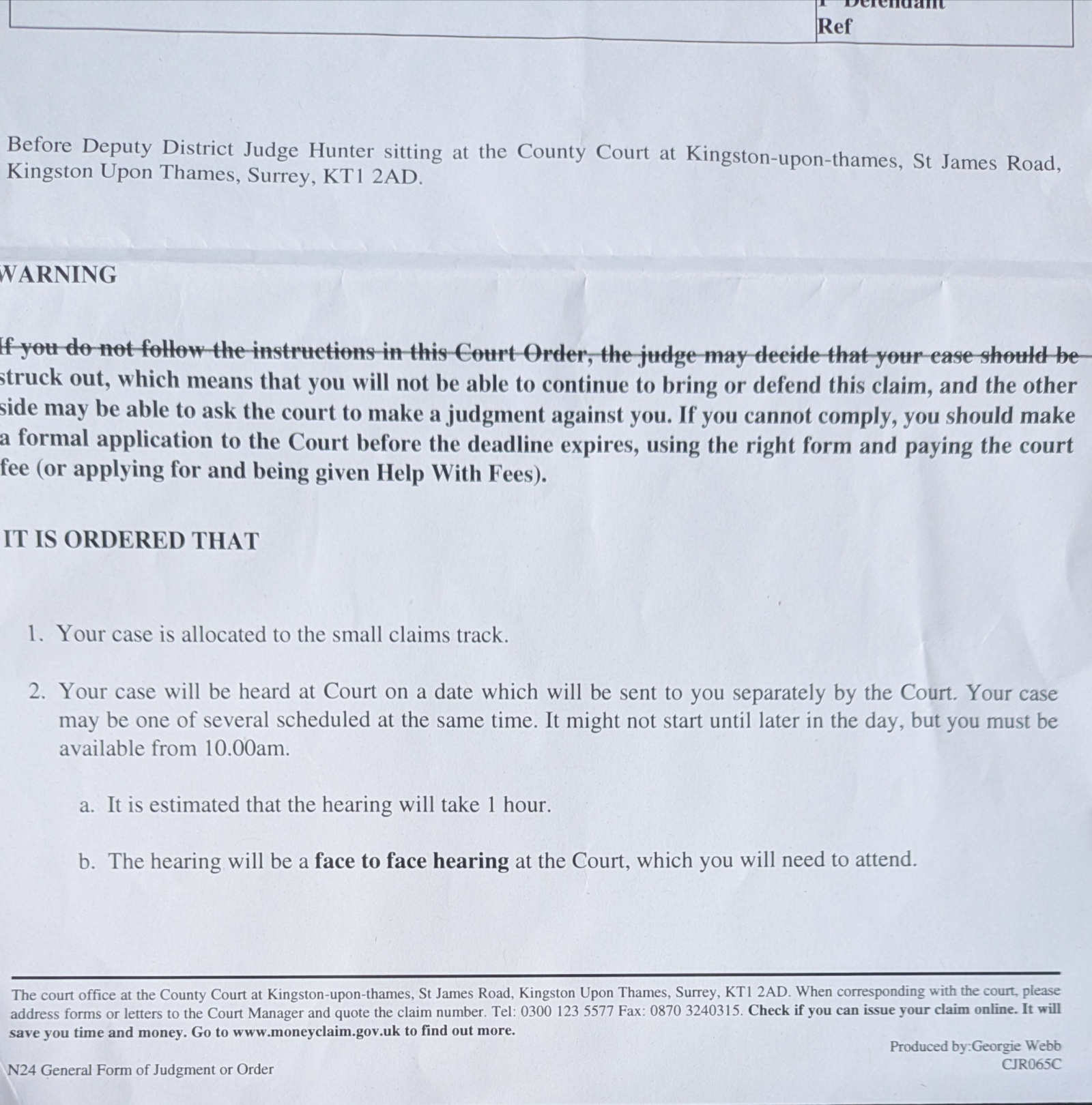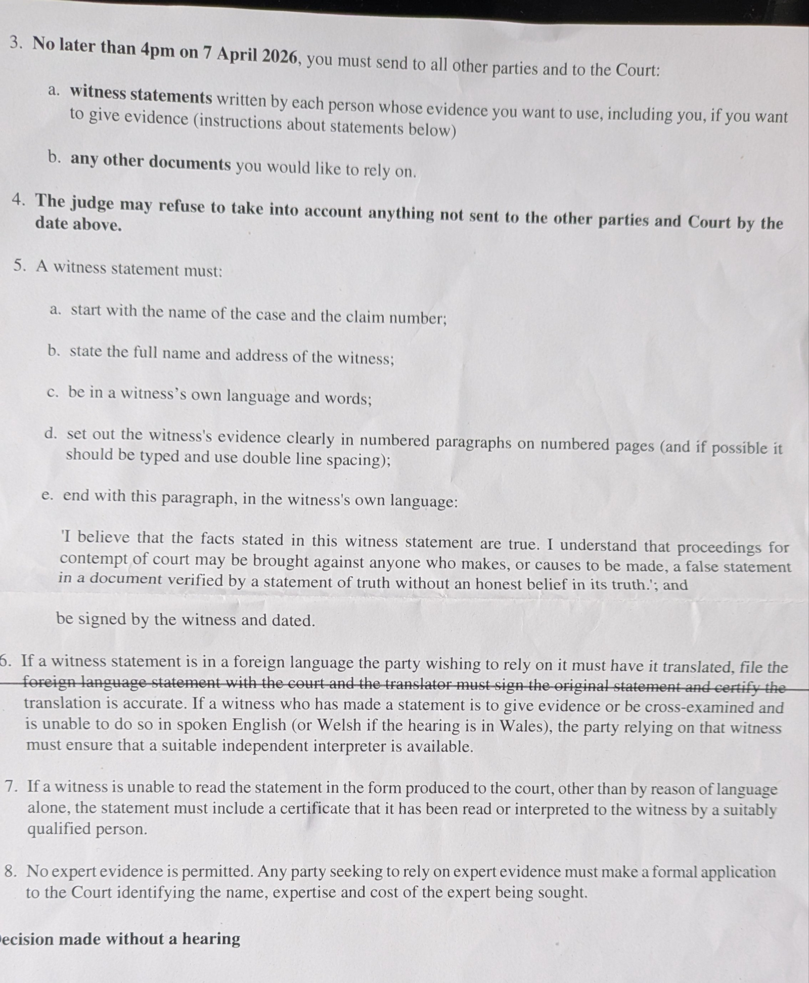 Received a General Form of Judgment/Order for a parking claim. The case has been allocated to the small claims track, but no hearing date has been given yet. The order instructs me to file and serve a witness statement by a 7th April.