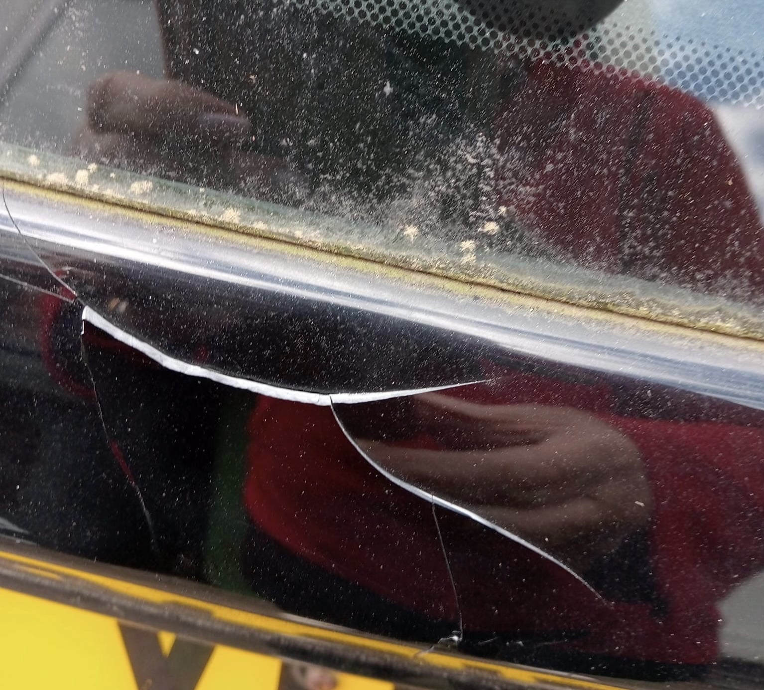 How's it happened? Somebody's reversed without looking. You can see where the trim piece is pushed in right on the fold, and it's bulged and fractured outwards above that, because it's got nowhere else to go.
