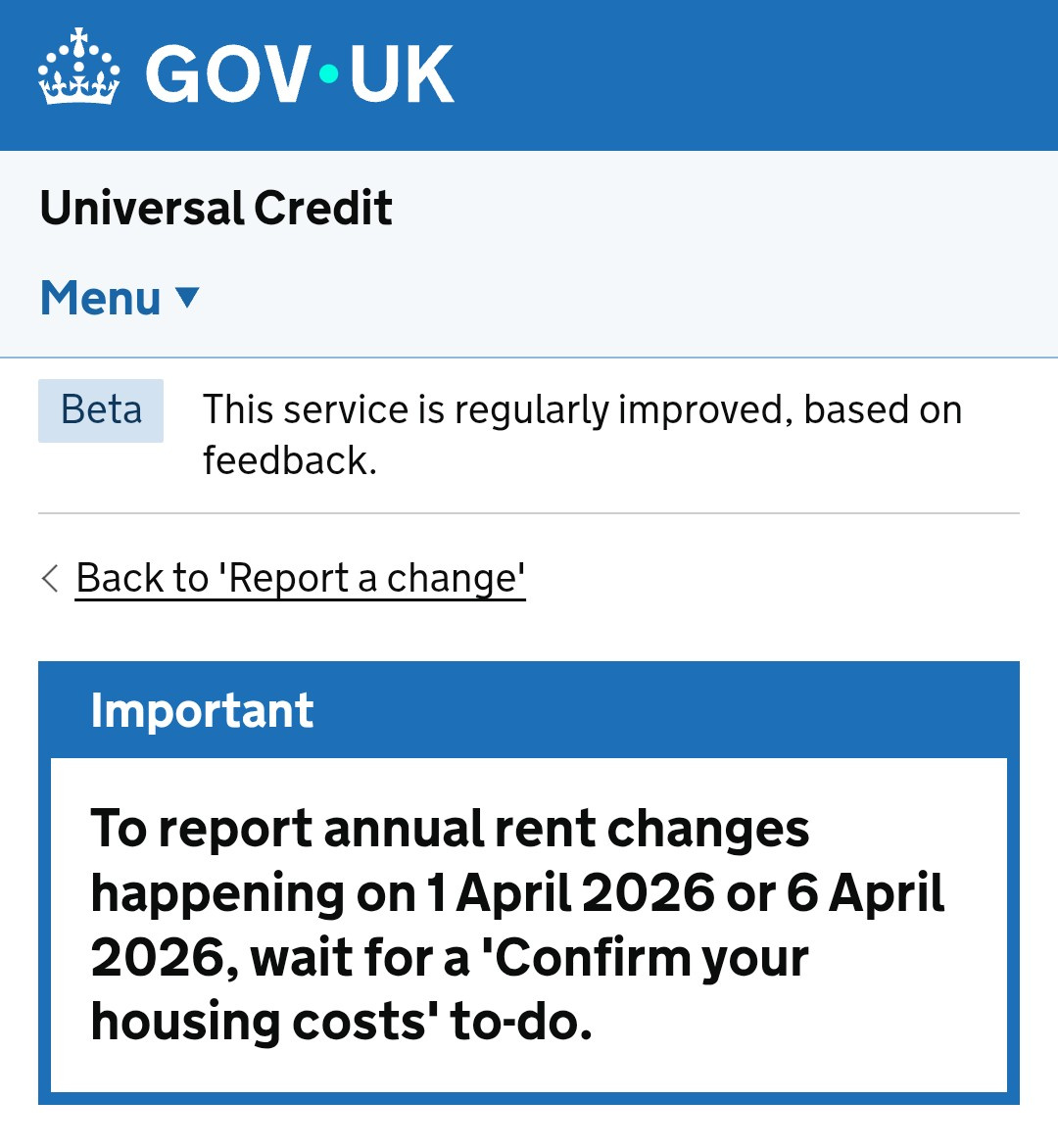 That banner is to prevent people reporting changes early. Local Authorities will start sending out letters in Jan/Feb informing renters of rent increases in April, and UC would receive a flood of CoC's trying to report something that hasn't happened yet.