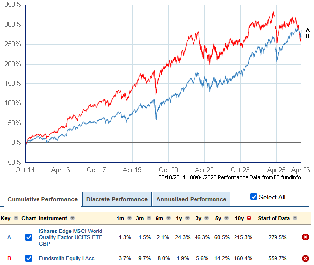 "…numerous better options offering investment in quality companies". The starting option is a world quality ETF like IWFQ, launched in 2014. Up until about five years ago Fundsmith beat it hands down; since then the ETF has been miles ahead. The ETF will select companies using metrics such as profitability and debt. At Fundsmith's annual shareholders' meeting Terry Smith will present his holdings' strong performance against similar metrics, yet investors' bottom line of share performance can be wildly different.
