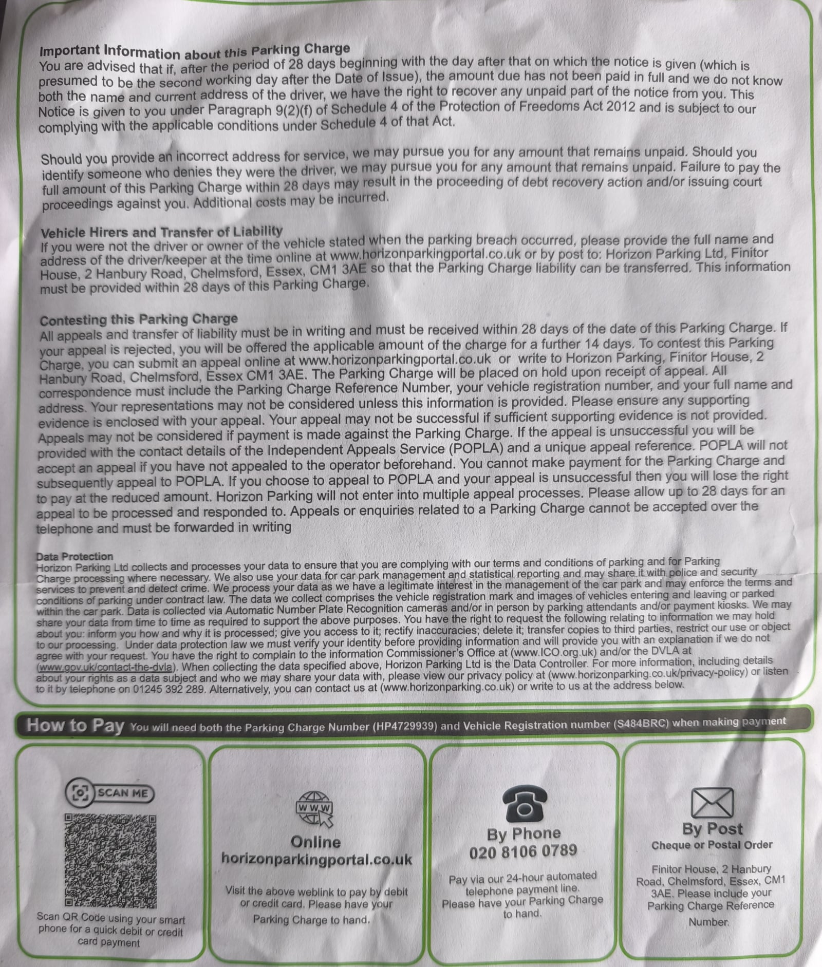 Horizon parking charge