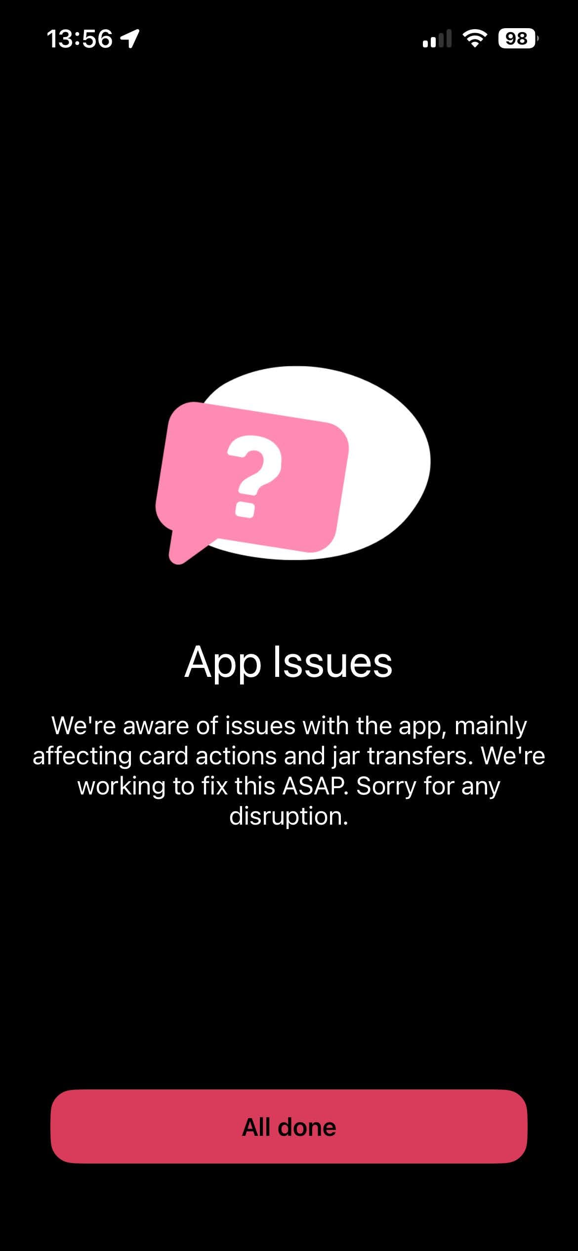 We've been using HyperJar for my son for years now, and it's been great. He's used it in Ireland and for spending when on school trips and out with friends. Until today, when he tried to pay for lunch at KFC with his friends and his transaction was reversed 3 times, then declined, even though he had plenty of funds available. My wife and I got notifications each time he tried to pay. We then had a distressed child calling who couldn't pay for lunch and we had to drive into town to deliver cash, not ideal. I contacted HyperJar support using the app 'agent' and was put in a queue of 64…that told me that there was something going on. About that time I spotted a pop up in the HyperJar app saying they were having issues with some payments.