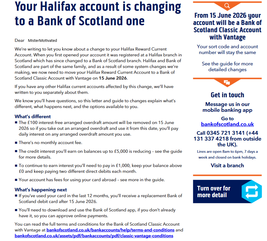 I did also say "option". If folk living in Scotland near a BoS branch want their Halifax branded account converted into a BoS equivalent that's fine. But the conversion from a Halifax Reward account to a BoS Classic Vantage involves a change to the T&C's and benefits - they aren't the same, as noted in the letter MisterMotivated posted. Therefore the change should be optional.