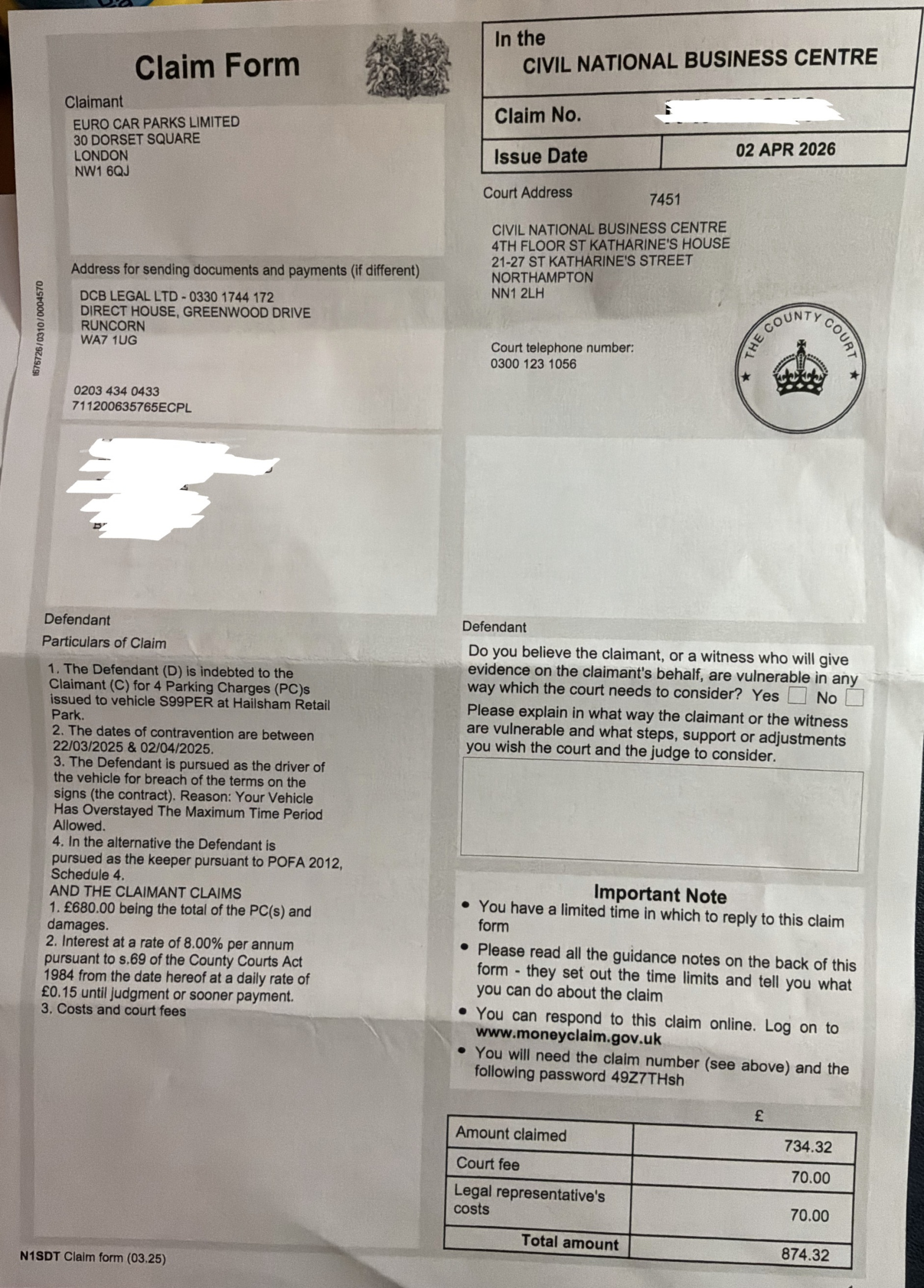 Here's your claim form, redacted, and clearly your para 3 of defence must mention that the POC fails to stage four dates but the vehicle was always authorised, due to an alternative contract for exemption, a longstanding verbal agreement with one of the stores.