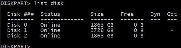 Okay, so I've been into diskpart in an Administrator command prompt and this is what it shows me for the list of disks: