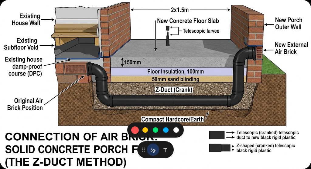 For our new porch, the airing brick needs to be extended. Currently there is about 8 mm space under it (1 brick ) and about 4 mm space above it . Looking online gives me multiple options. can i use a straight duct to connect to the outer side. or should i definitely go for a z duct as in the attached image. some of the images are attached. Appreciate any advice. The porch pad will be updated with proper insulation ( 70 mm phoenolic board as I have some left over of it which fits the porch) and thinking of screed with electric underfloor heating coil and LVT on top of it .