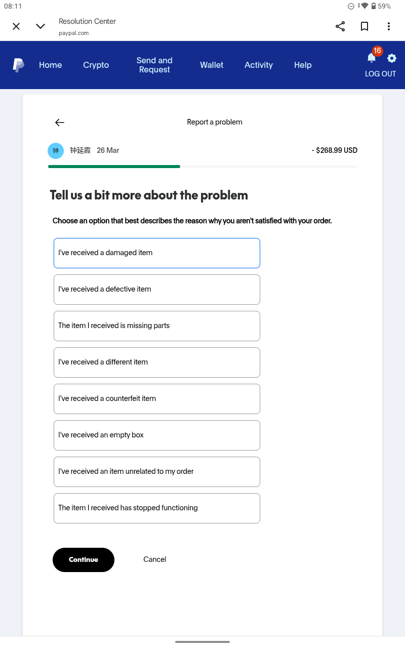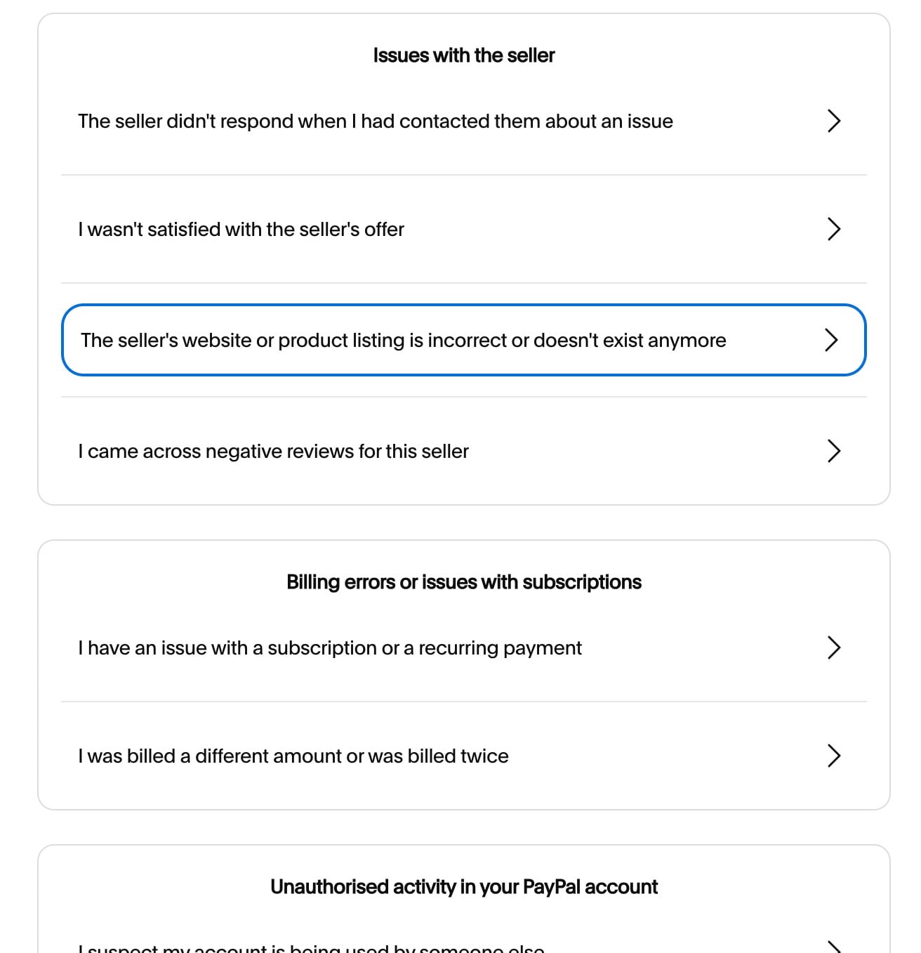 My next step was to open a dispute with Paypal, but none of the pre-determined categories fits the situation and I'm stuck.