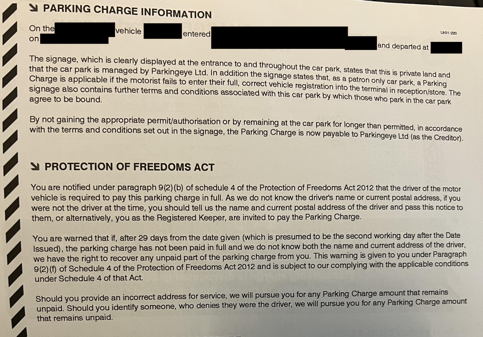 - It says "The signage, which is clearly displayed at the entrance to and throughout the car park, states that this is private land and that the car park is managed by ParkingEye Ltd. In addition the signage state that as a patron only car park, a Parking Charge is applicable if the motorist fails to enter their full, correct vehicle registration into the terminal in reception/store. The signage also contains further terms and conditions associated with this car park by which those who park in the car park agree to be bound. By not gaining the appropriate permit/authorization or by remaining at the car park for longer than permitted, in accordance with the terms and conditions set out in signage, the Parking Charge is now payable to ParkingEye Ltd (as the Creditor)