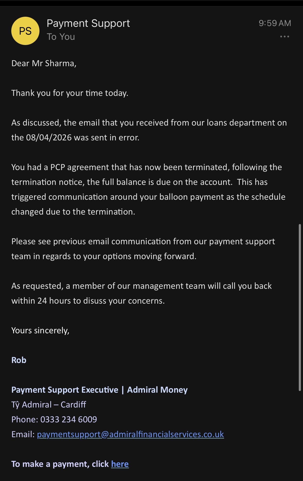 After falling into temporary financial difficulty, I engaged openly, made a goodwill payment, and tried to resolve matters constructively. On 8 April 2026, I was emailed formal options regarding my PCP agreement, including returning the vehicle. Shortly afterwards, those options were withdrawn without clear explanation, and settlement figures changed within days.