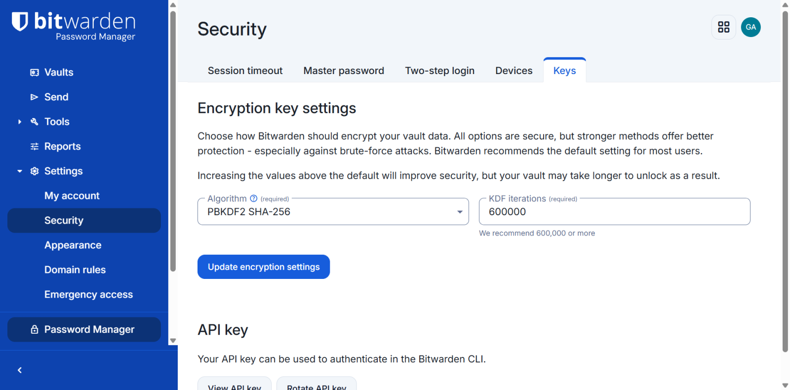Bitwarden: Update your encryption settings