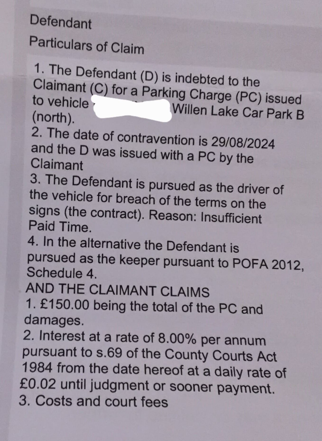 and it's hard to respond because the terms of the contract (parking sign) are not supplied, explained or pleaded