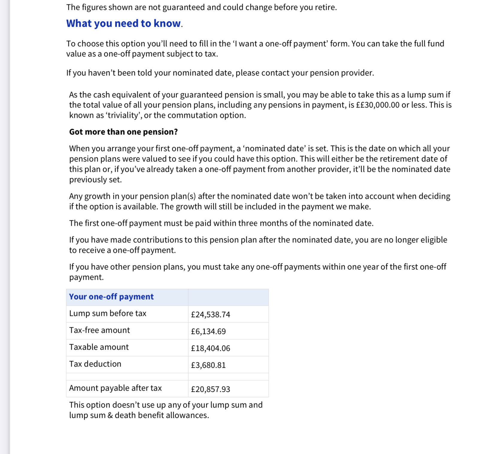 So if this pension has a value of £24500 then all your other pensions would have to be valued at less than £5500 for you to qualify for the one off lump sum. Does that sound likely?