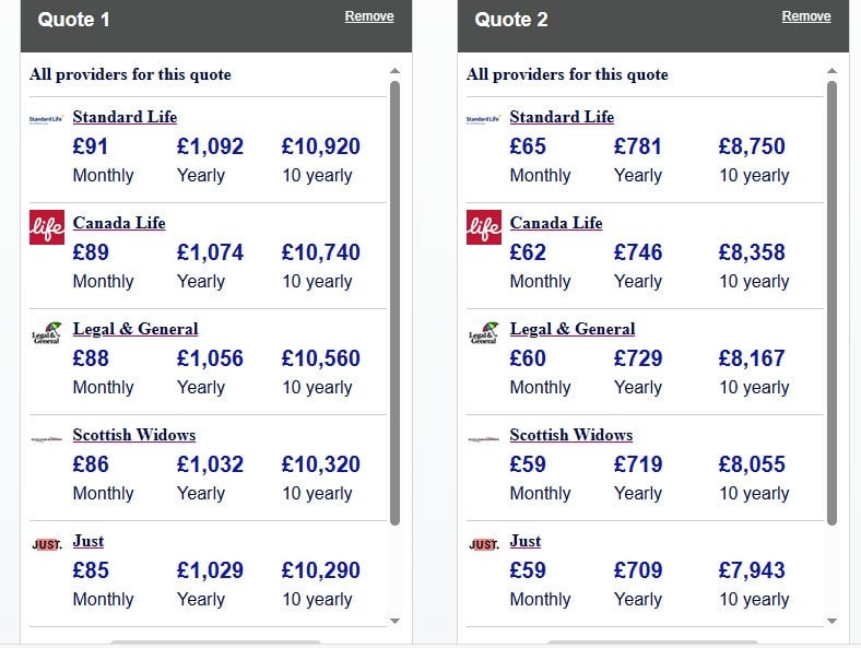I used basic factors but changing one of those factors above could increase/decrease the monthly payments depending upon your choices, it really is an individual quote. Both quotes above were supplied by Standard Life.
