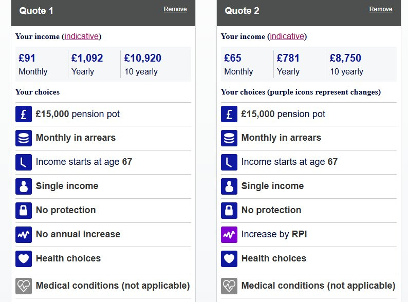 Although it would be nice to see what the quotes would be without the 25% lump sum the calculators don't give that option. (you can roughly extrapolate though by dividing the given income by 3 then multiplying by 4).