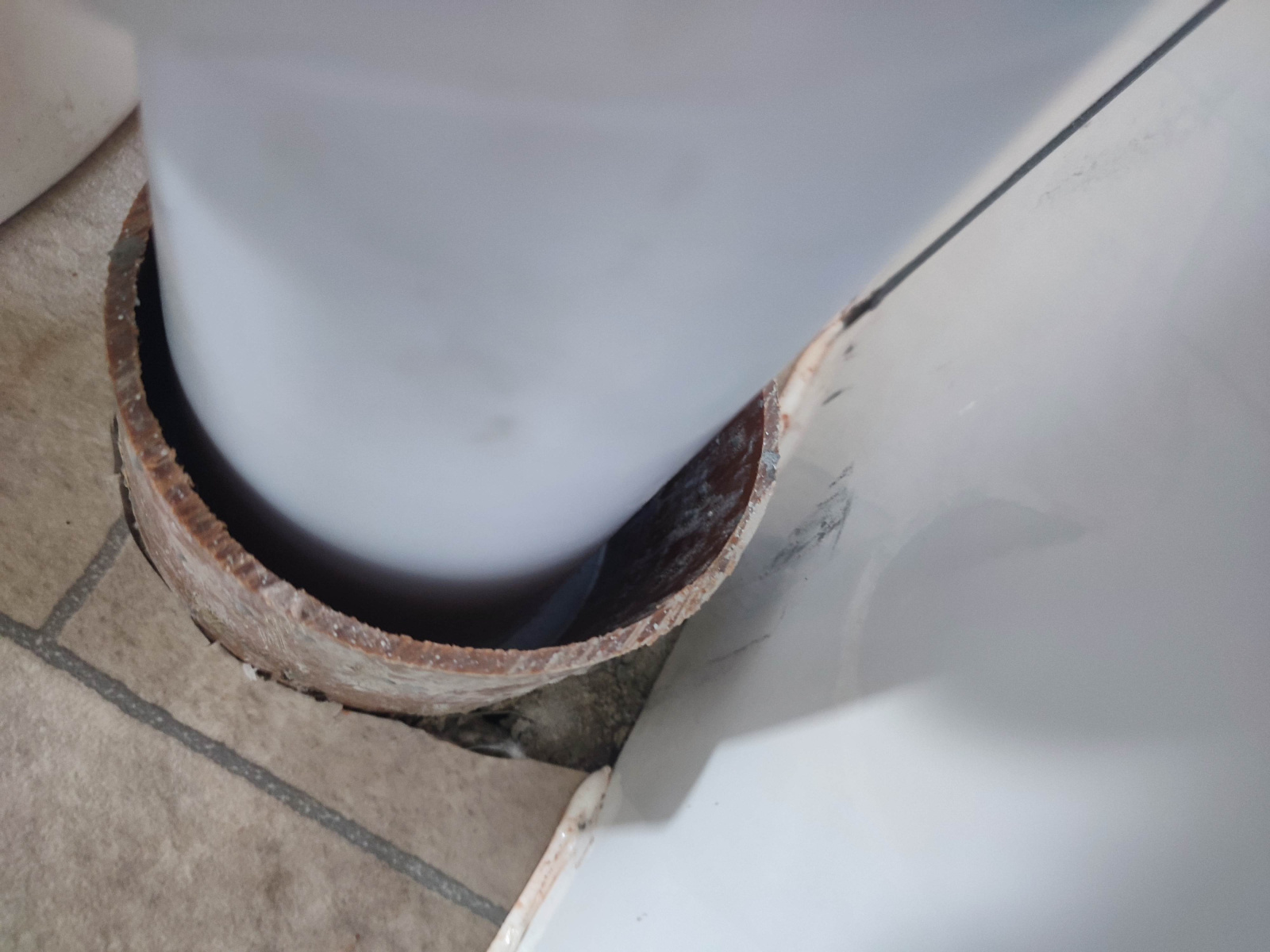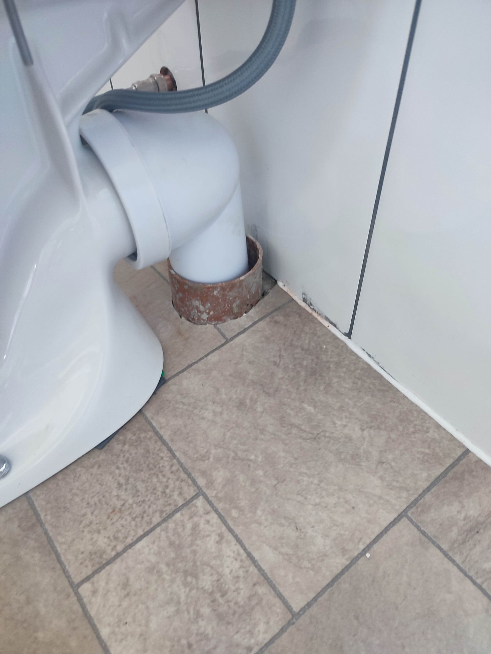 Is the white pipe from the toilet sealed into the brown pipe into the floor? It needs to be sealed to prevent odour returning from the sewer.