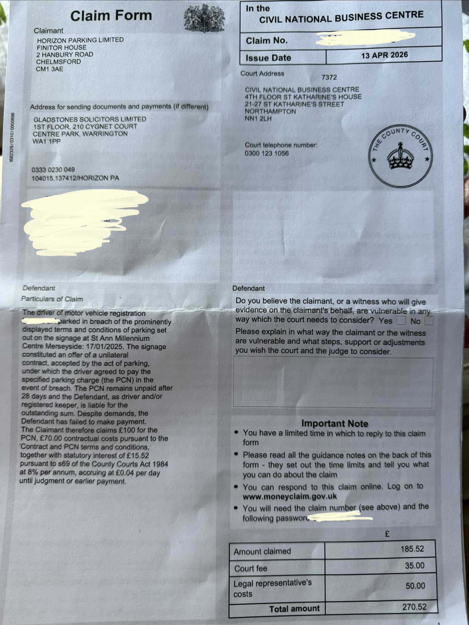 Note, its a Horizon claim via Gladstones dated 13th April, no breach pleaded